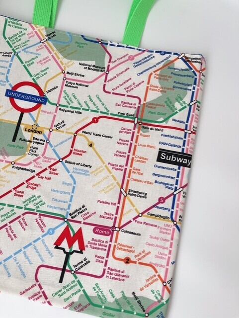世界のメトロ路線図がプリントされたトートバッグ。